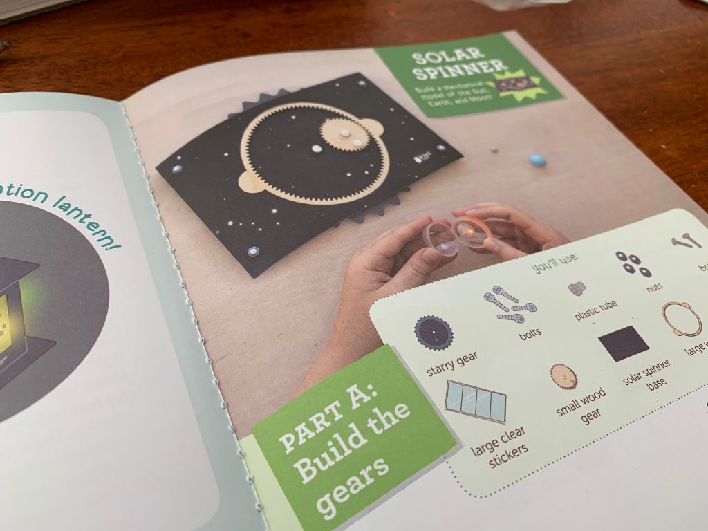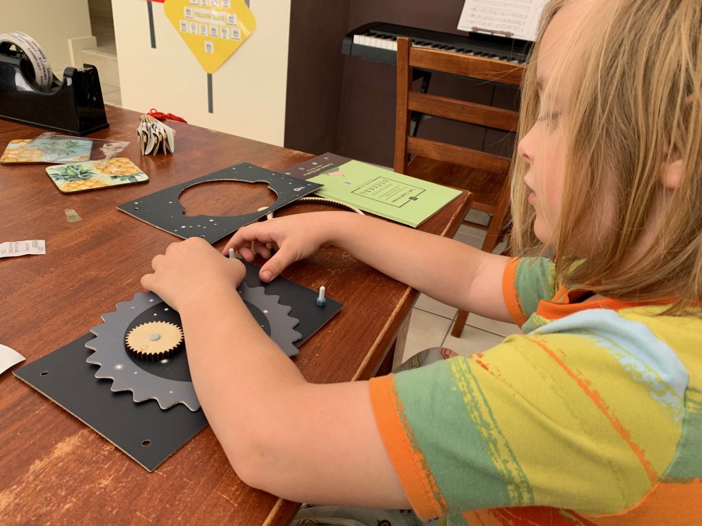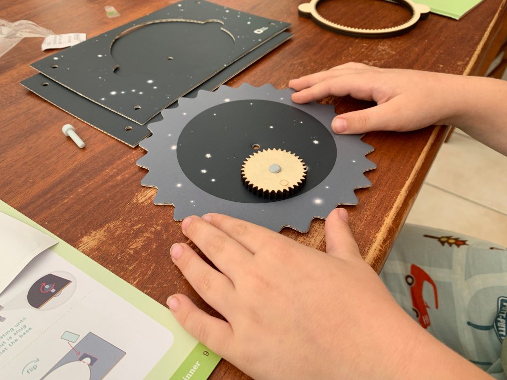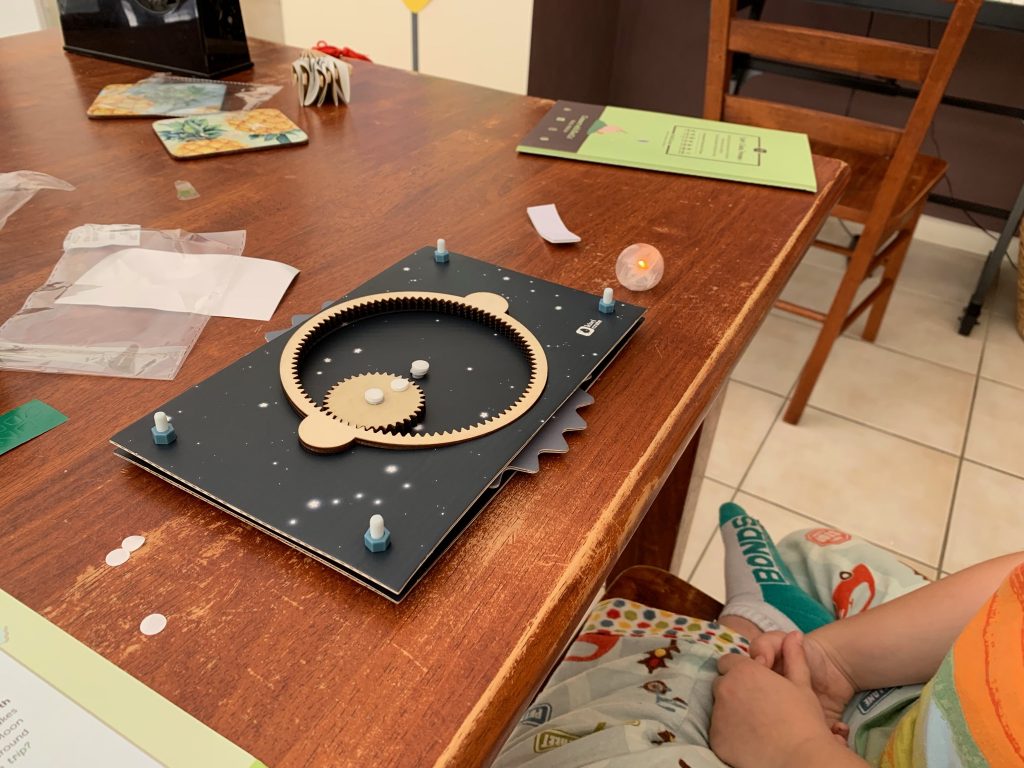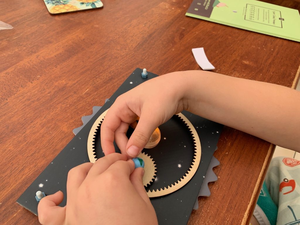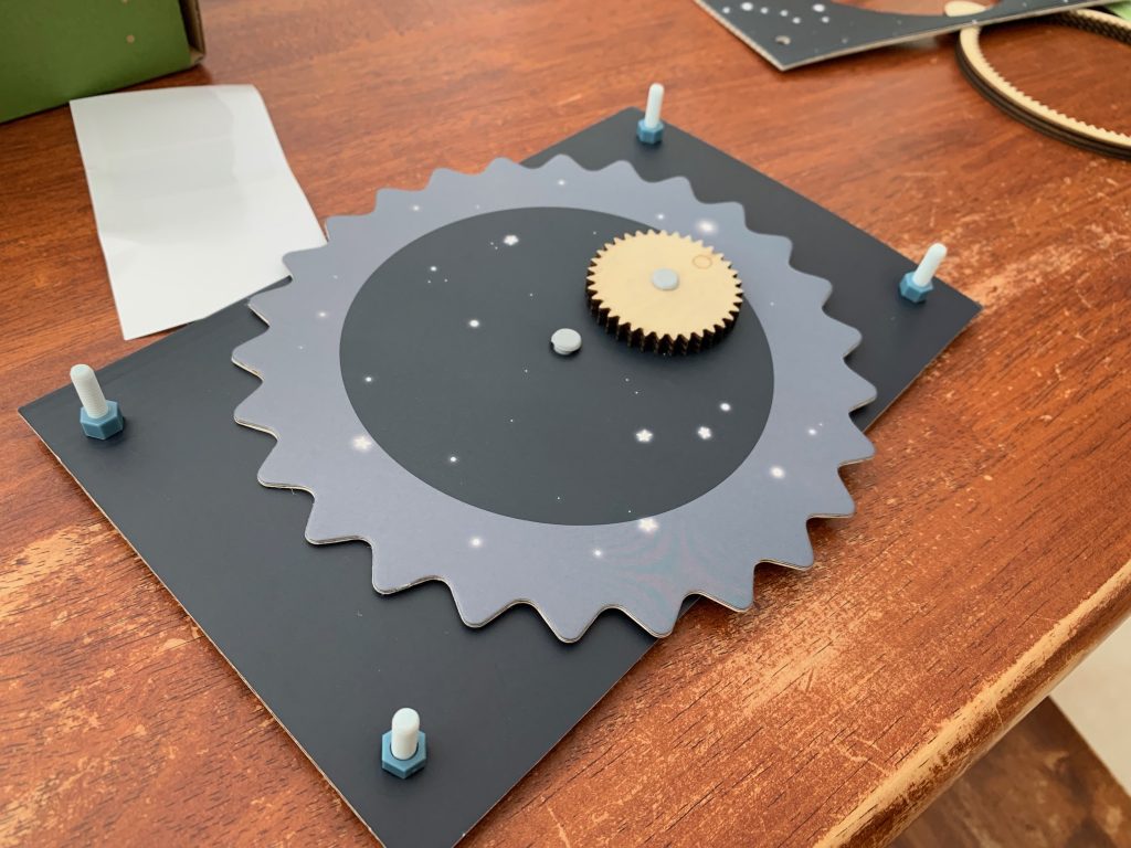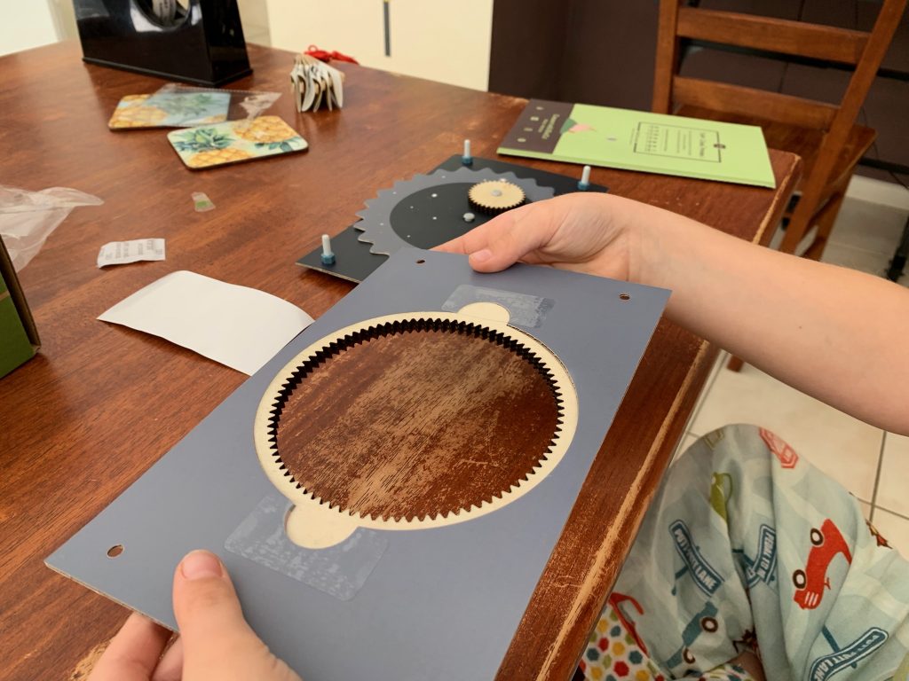 Otto’s latest Kiwi Crate is all about exploring the stars. In the first activity he gets to play with gears and use them to engineer a model system of the Sun, Earth, and Moon.