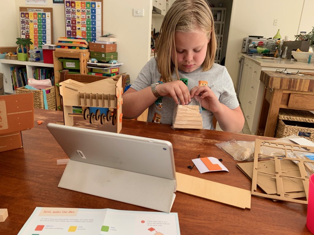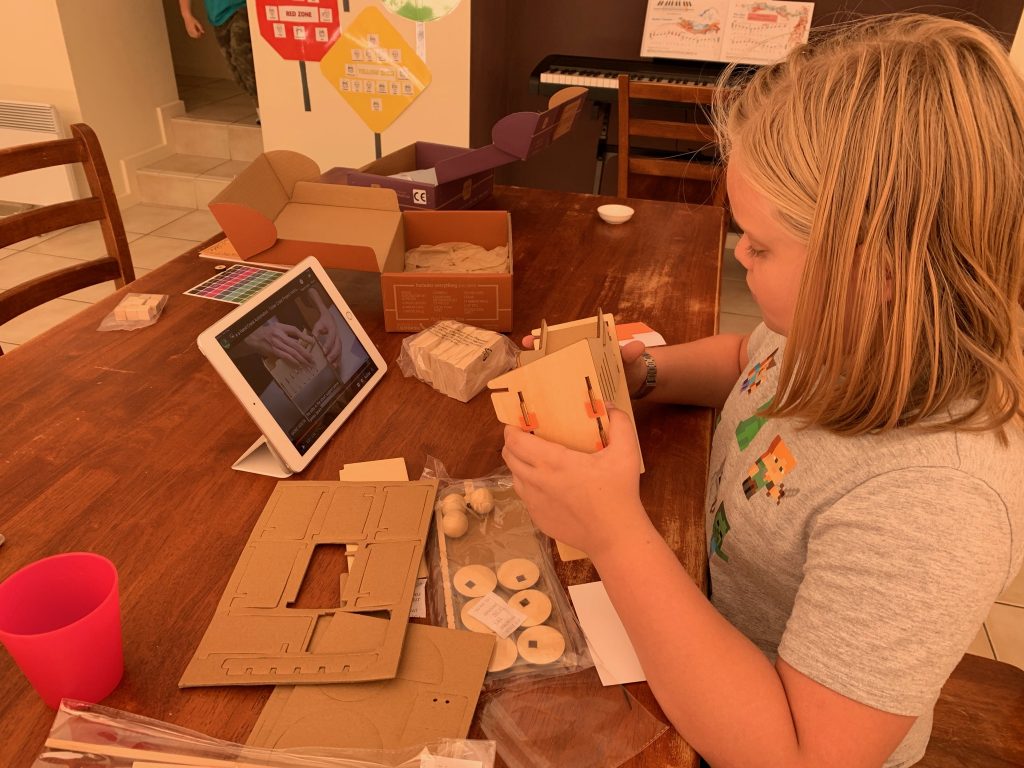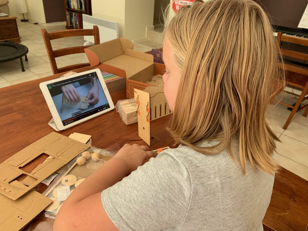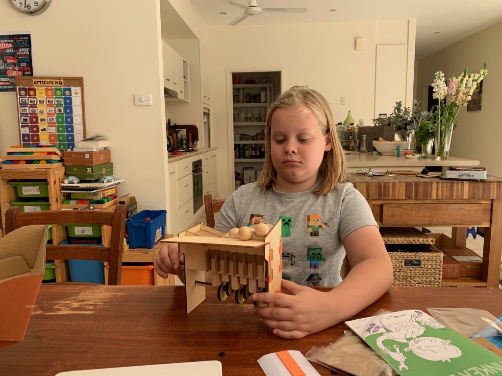 Atticus is learning to engineer a hand-cranked, wooden automaton that makes a marble climb stairs. He’s also exploring the gears and cams that make the mechanics work.