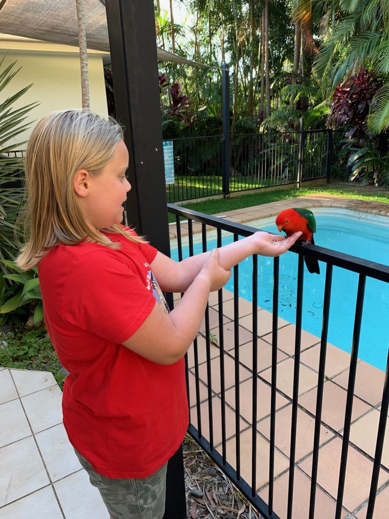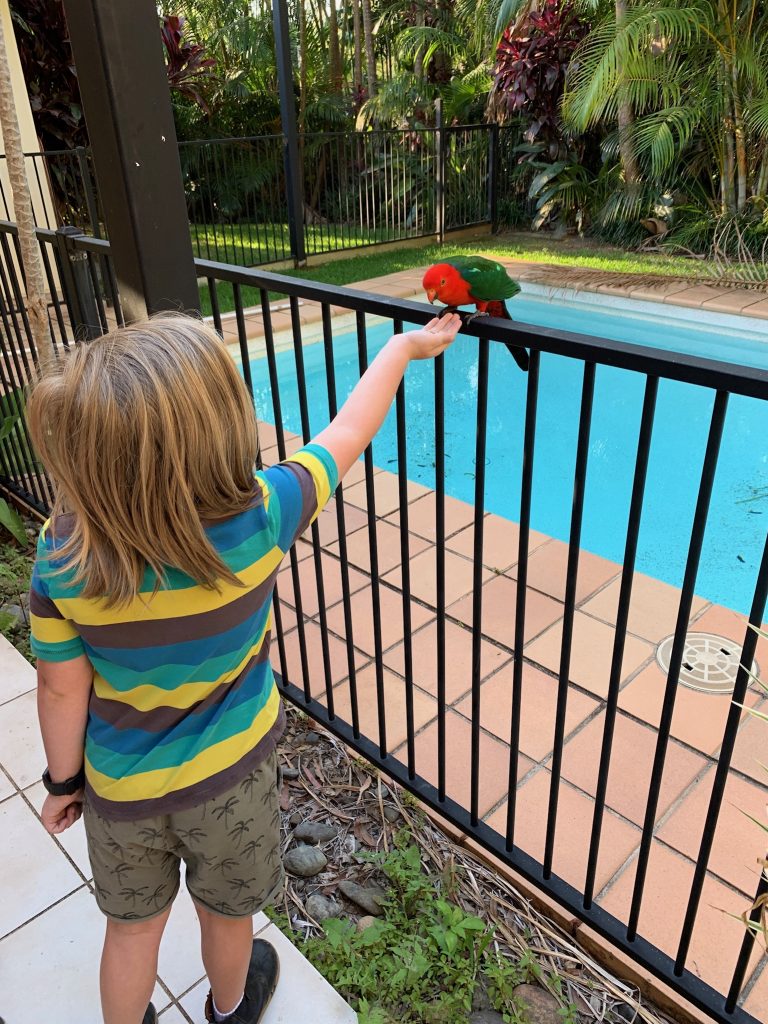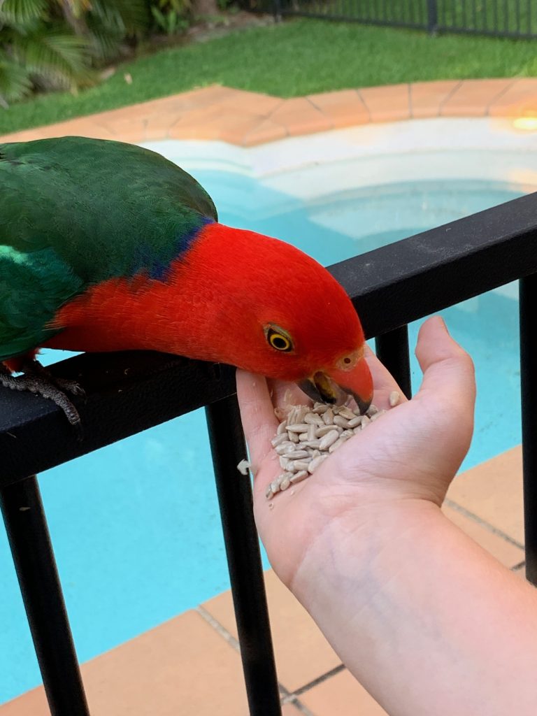 Atticus / English / Otto Australian King Parrot We’ve had a visitor the past few weeks. It was so tame we initially thought it was someones pet. But no, according to our bird book it’s an Australian King Parrot and they’re known for their friendliness.