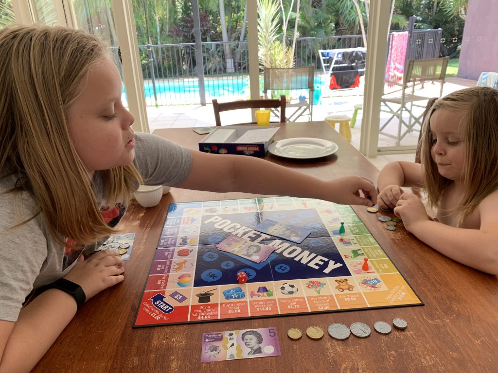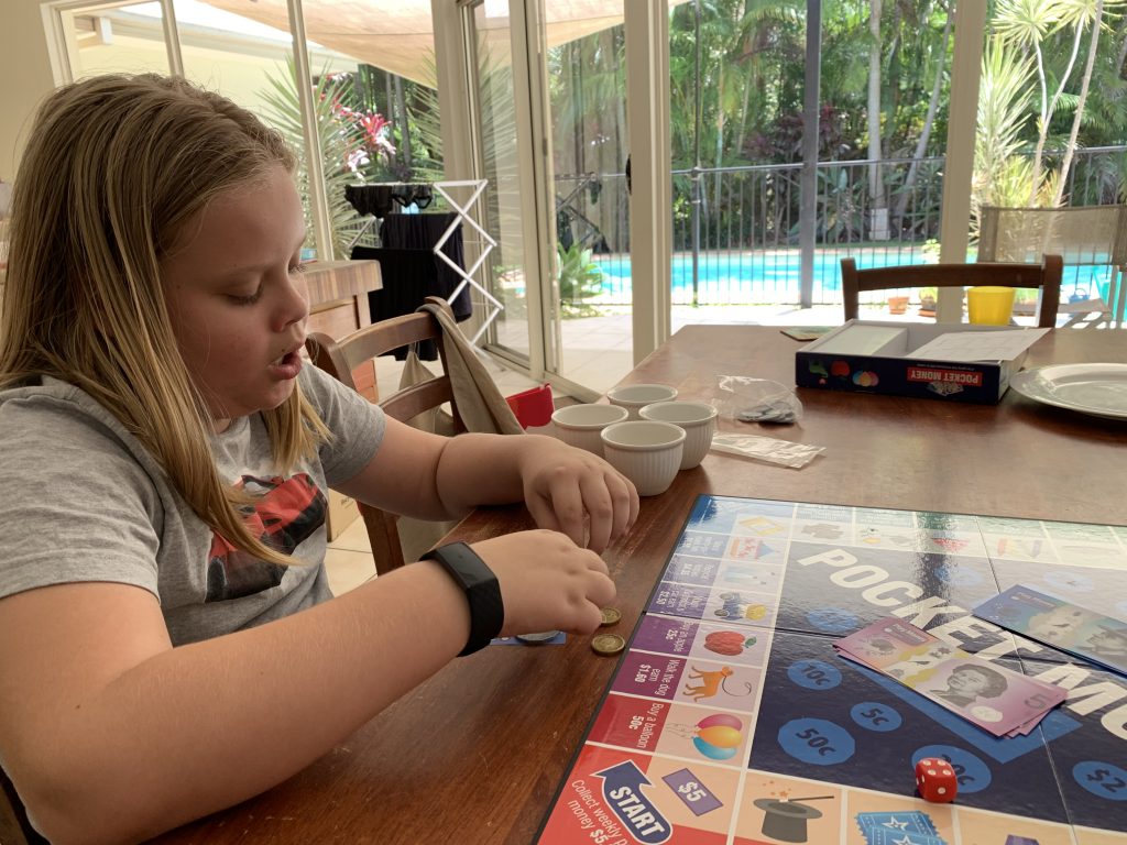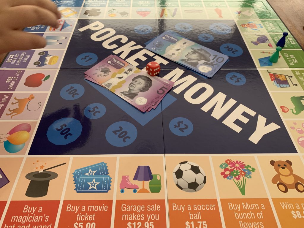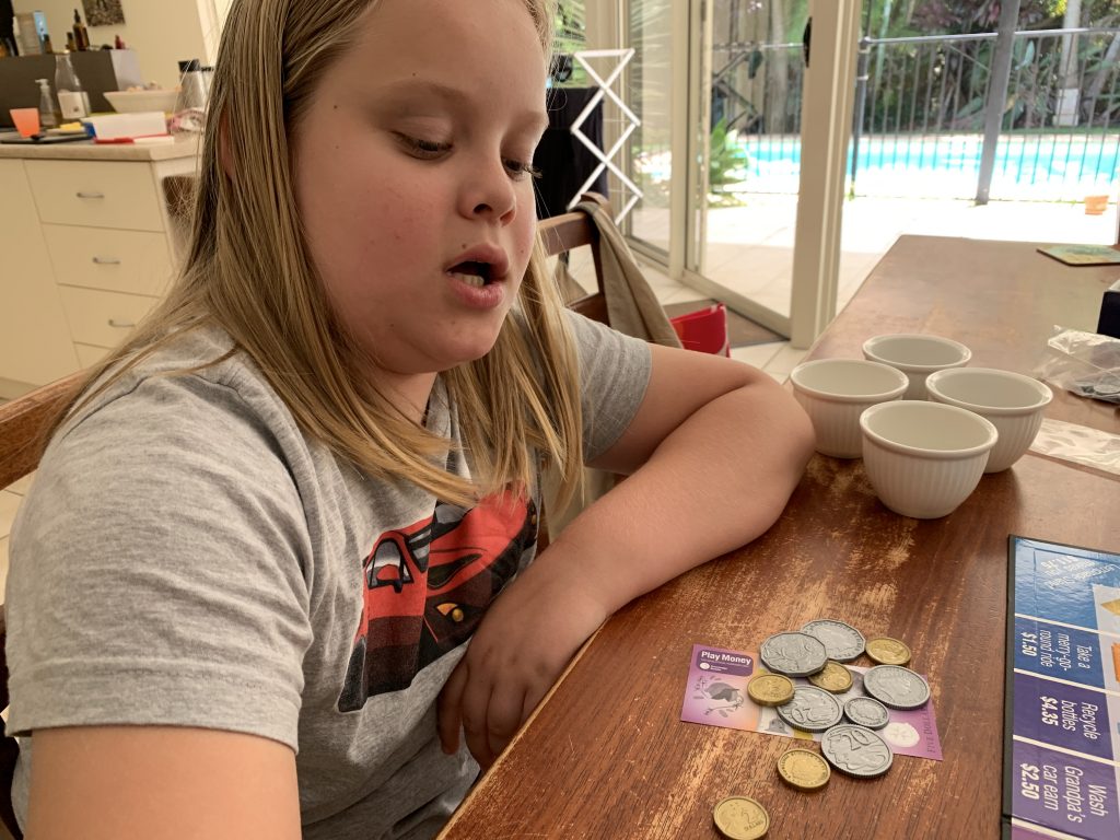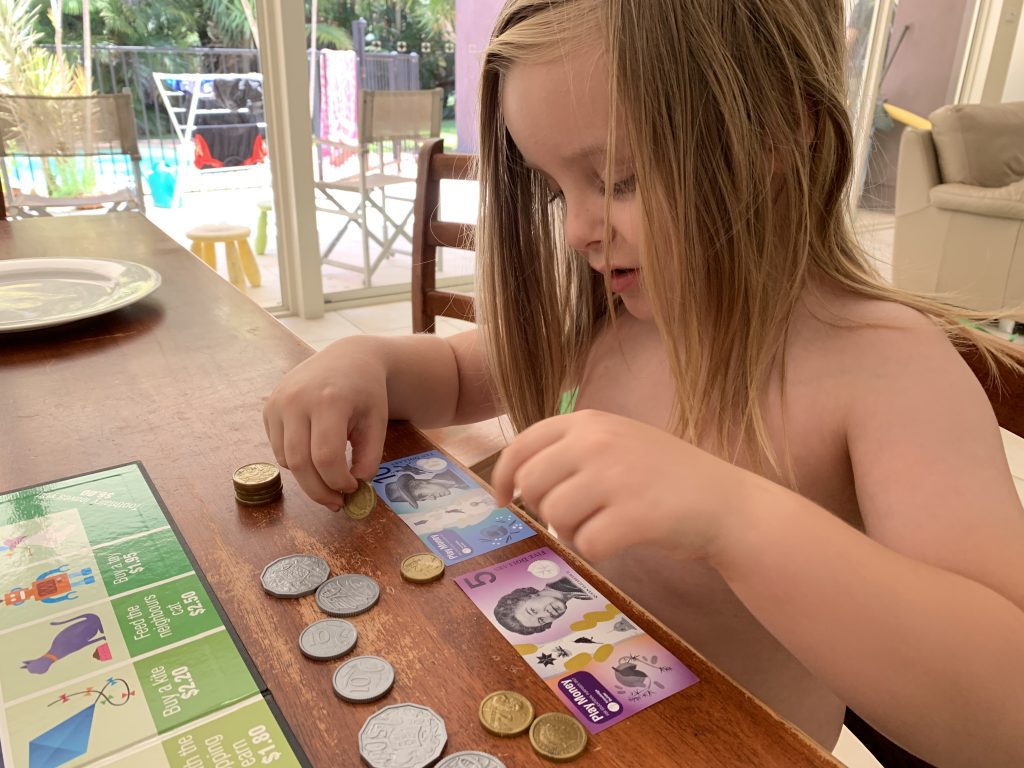We’re learning all about money and maths. Atticus is the banker today and he needs to do all the sums to ensure we all get the right change.