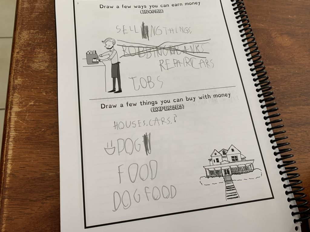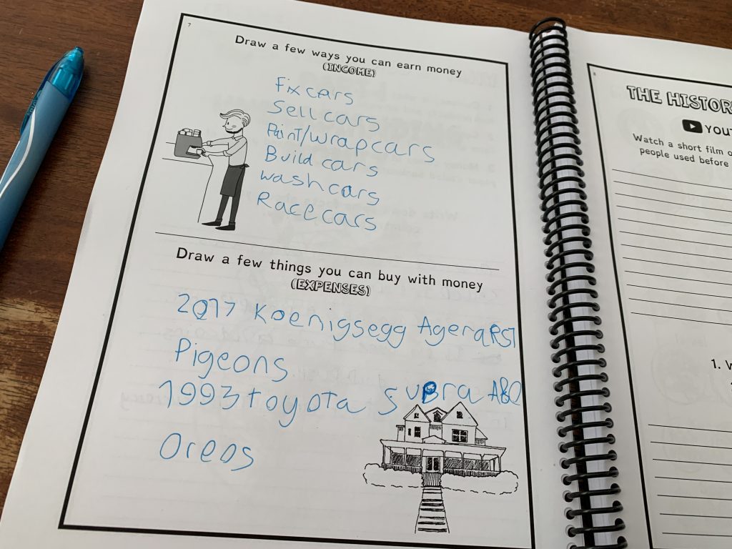 Atticus / English / Maths / Otto Earning Money Working on our Money, Business and Economics journal. Today we are looking at ways one can earn money or an income. Both boys wrote down some ways they could earn money and what they’d like to spend their money on. Otto’s WorkbookAtticus’s Workbook