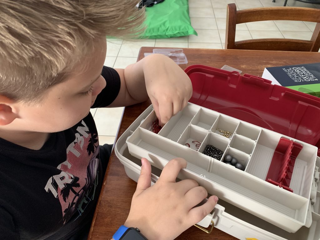 We bought some fishing gear, aka tackle and Atticus decided he wanted to get it all organised for our next fishing trip.