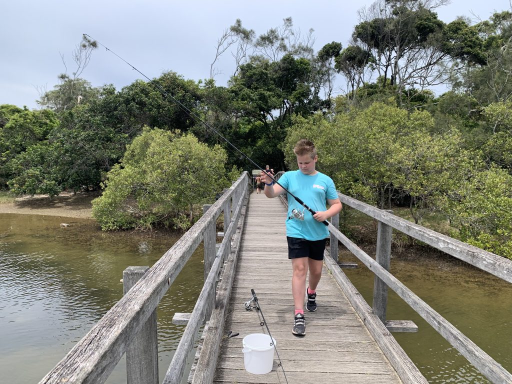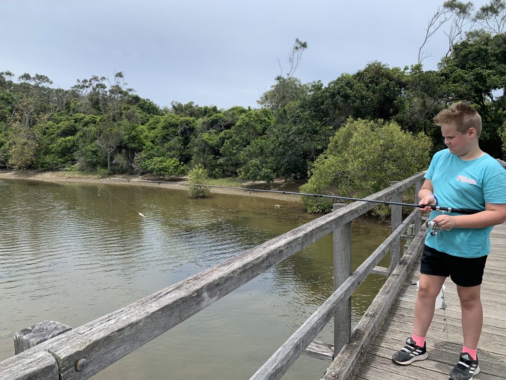 Both boys were able to handle the raw prawns and put them on their hooks themselves. In fact both were able todo most of their fishing independent of me (which is big) and occasionally ask their friend Bentley or his nan Cath for some help. This was a great opportunity to practice some socialisation and feel ok asking someone who is not me to help them.